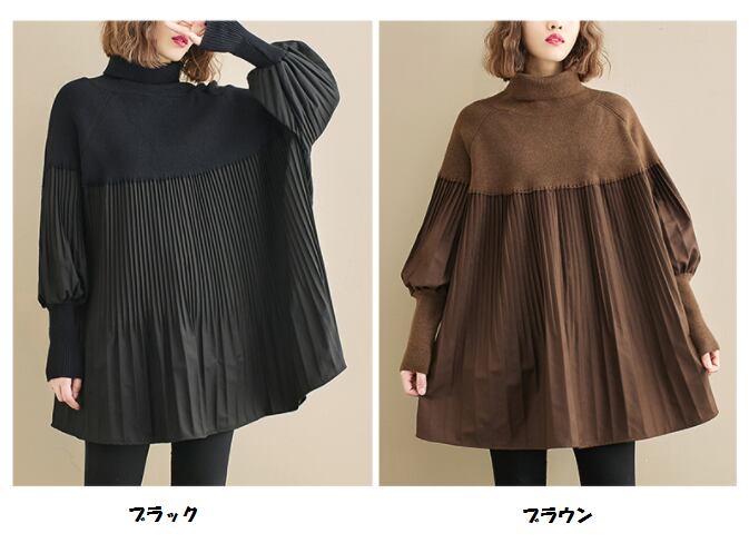 【ふんわりプリーツチュニック☆ニット ドッキング トップス】 トップス チュニック ワンピース ニット プリーツ ドッキング 大きいサイズ 伸縮性 ハイネック タートルネック セーター ゆったり 体型カバー 長袖 20代 30代 40代 50代 送料無料