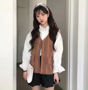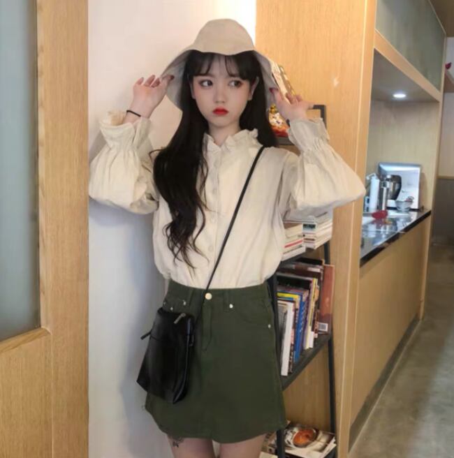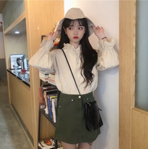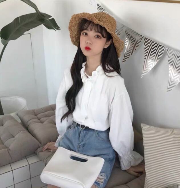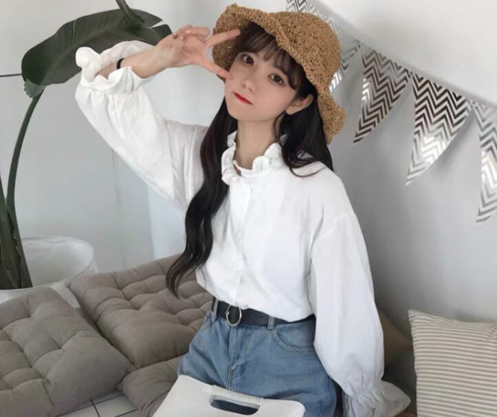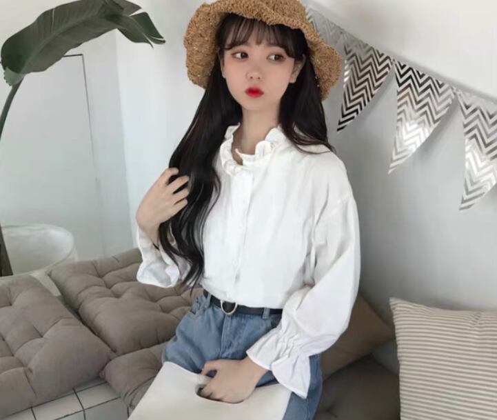 【女の子らしさ満載☆シンプル フリルネック シャツ】 トップス ブラウス シャツ フリルネック スリル袖 キャンディースリーブ スタンドネック ナチュラル かわいい シンプル カジュアル きれいめ レイヤード 重ね着 着回し 韓国ファッション 春 秋 10代 20代 30代 送料無料のご案内です☆