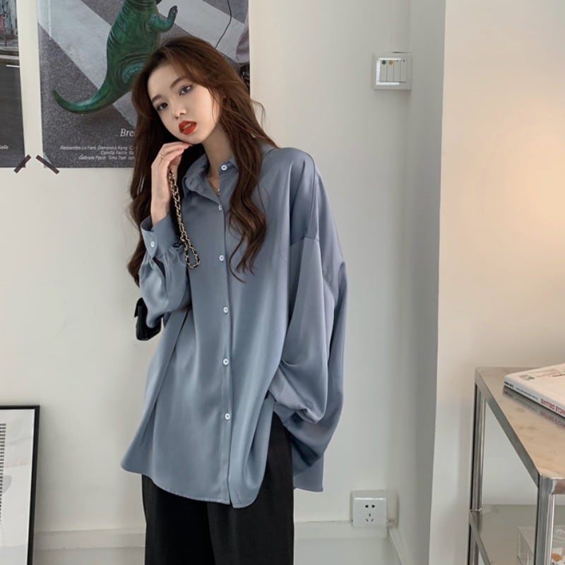 【ヘビロテなテロシャツ☆サテン 長袖 ブラウス♪】 オフィス 通勤 きれいめ シャツ レディース トップス ブラック ホワイト ブルートップス レディースのご案内です☆