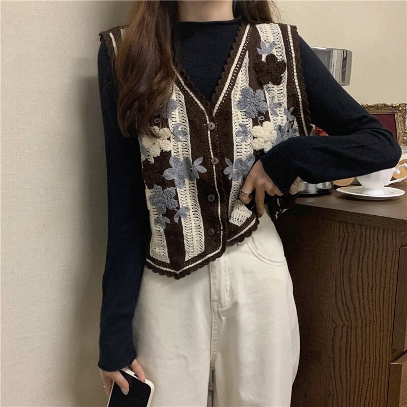 【ショート丈ニットベスト☆ゆるっと花柄手作り風 ベスト】グレー ホワイト 花柄 ベスト エレガント キュート 大人可愛い 韓国ファッション 春 秋 20代 30代 40代 送料無料