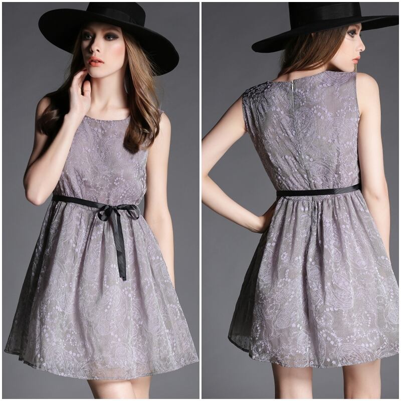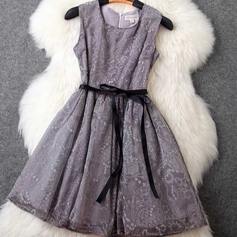 フレア ワンピース ペイズリー花柄 ウエストリボン付き グレーXLのご案内です☆