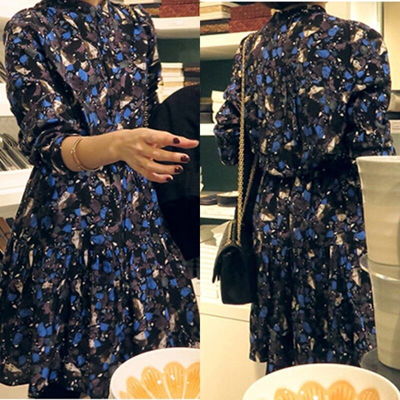 プリント シフォン ドレープ シャツ ワンピース スタンドカラー 長袖 カジュアル