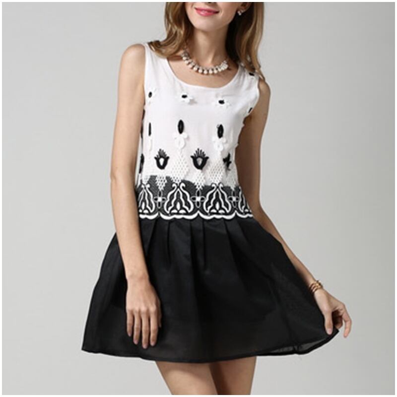 【ワンピース】ノースリーブ フレア ドッキングワンピース モノトーン 花柄 刺繍 ウエスト 切り替え