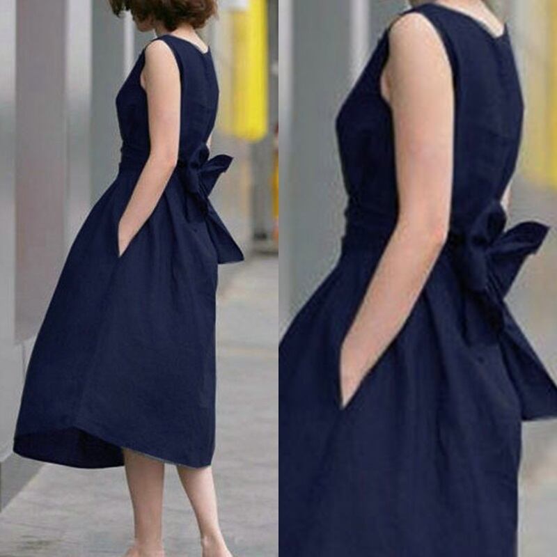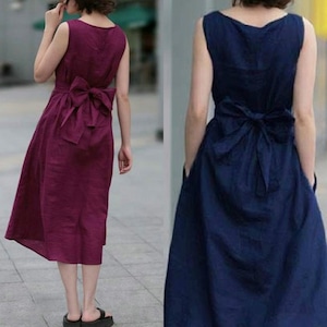 バックリボン 飾り リネン ノースリーブ ミディ ワンピース かわいい カジュアルのご案内です☆