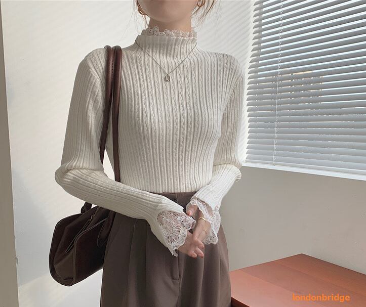 【大人気☆レース付き ハイネック リブニット】トップス リブニット レディース レース襟 レース袖 フリル レース レイヤード ニット カットソー 華やか 大人可愛い 韓国ファッション 春 秋 冬 長袖 プルオーバー 送料無料