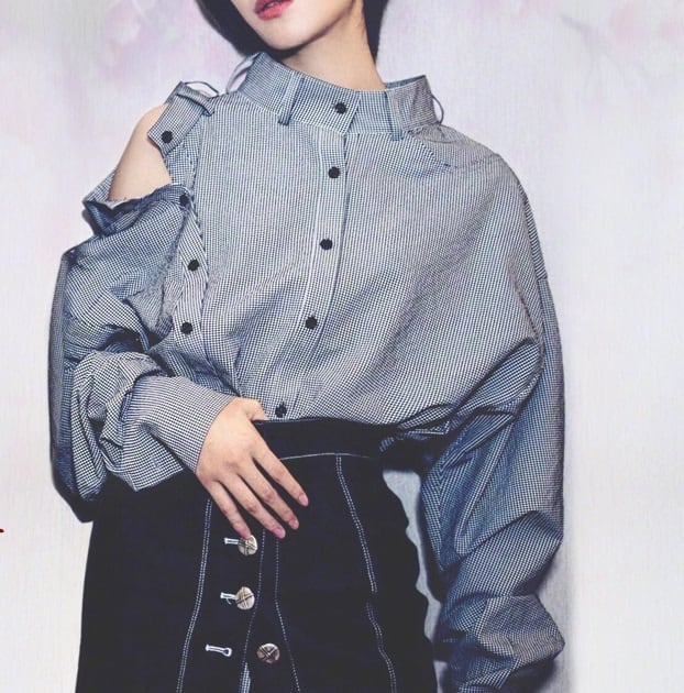 【春新商品★肩出し袖 チェックブラウス レディース トップス】 アシンメトリー 前開き チェック シンプル 長袖 新作 春 夏 女性 襟 なし ブラウス しゃれ着 デート 送料無料のご案内です☆