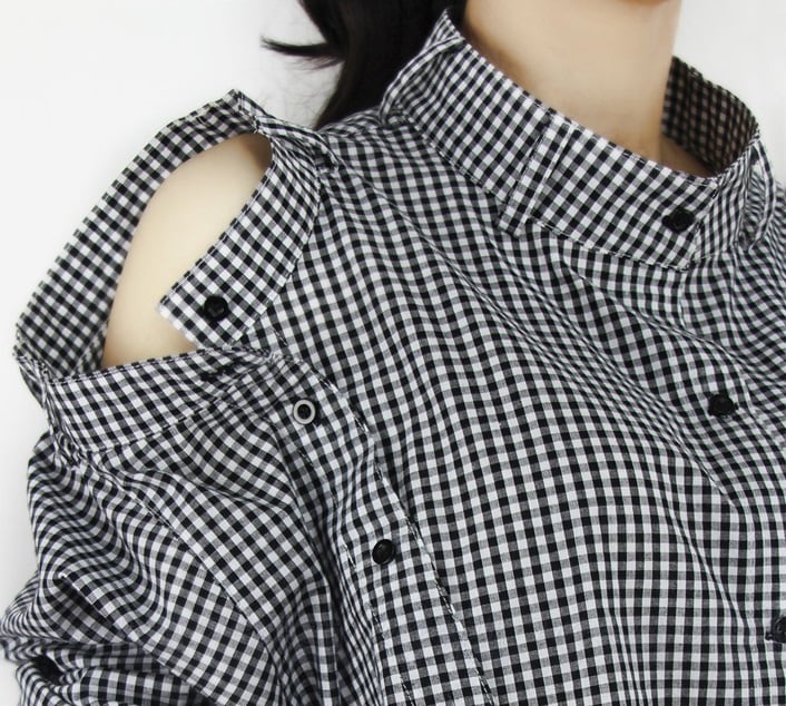 【春新商品★肩出し袖 チェックブラウス レディース トップス】 アシンメトリー 前開き チェック シンプル 長袖 新作 春 夏 女性 襟 なし ブラウス しゃれ着 デート 送料無料