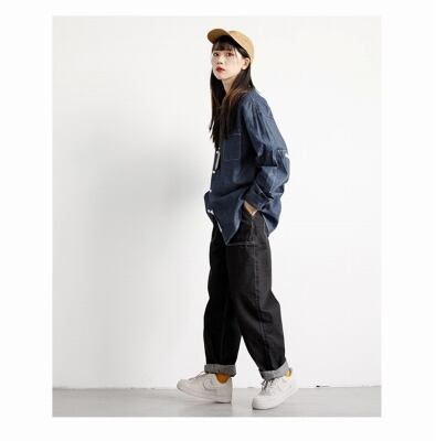 スタンダードな形のシャツです。インディゴ風な色合いで、柄物と合わせても可愛いです!