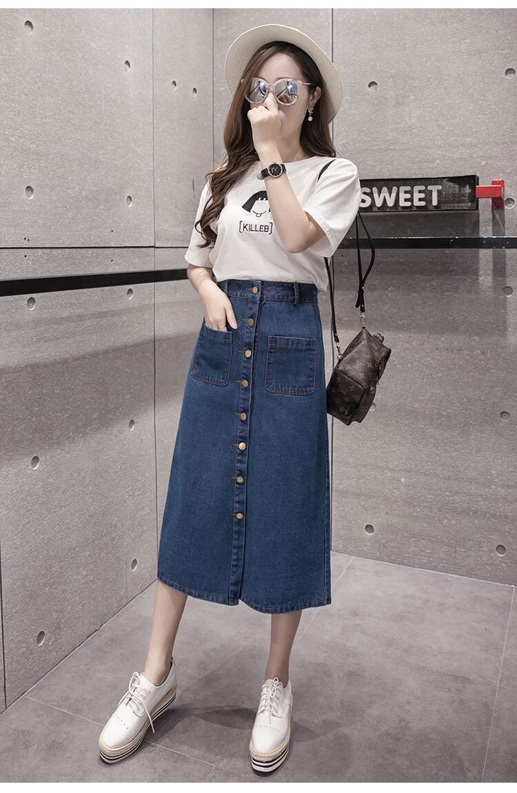 デニム風のひざ下のスカートです。スカートにインしても、大き目のトップスと合わせても何にでも合わせやすい万能アイテムです!!