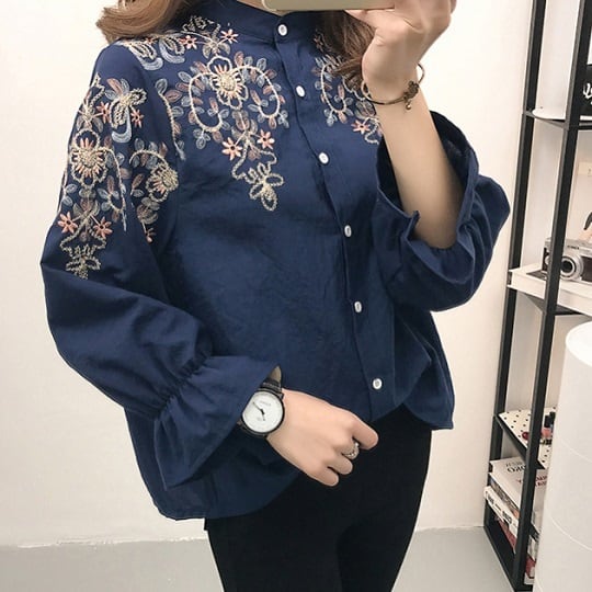 花刺繍シャツ トレンド 刺繍 花柄 小花 ボヘミアン ブラウス シャツ トップス フラウンス袖 フリル袖 ヴィンテージライク レトロ 七分袖 春 夏 秋 女性 綿 コットン ホワイト 白 ネイビー 紺 大きいサイズ オーバーサイズ レディース 送料無料