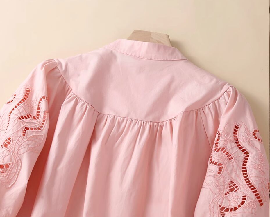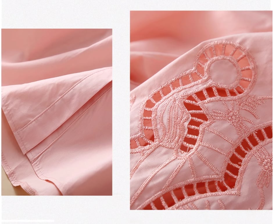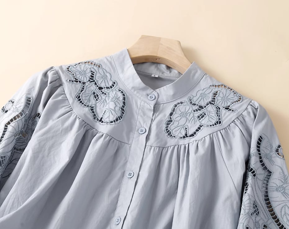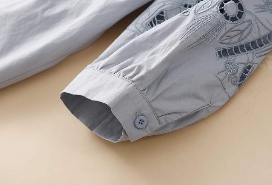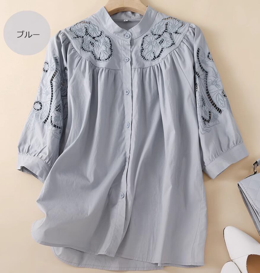 【刺繍がポイント☆七分丈 レディース ブラウス】トップス ブラウス シャツ レディース 七分丈 刺繍 スタンドネック ノーカラーシャツ リネン コットン 春 秋 冬 きれいめ オフィスカジュアル 通勤 通学 20代 30代 40代 50代 送料無料のご案内です☆