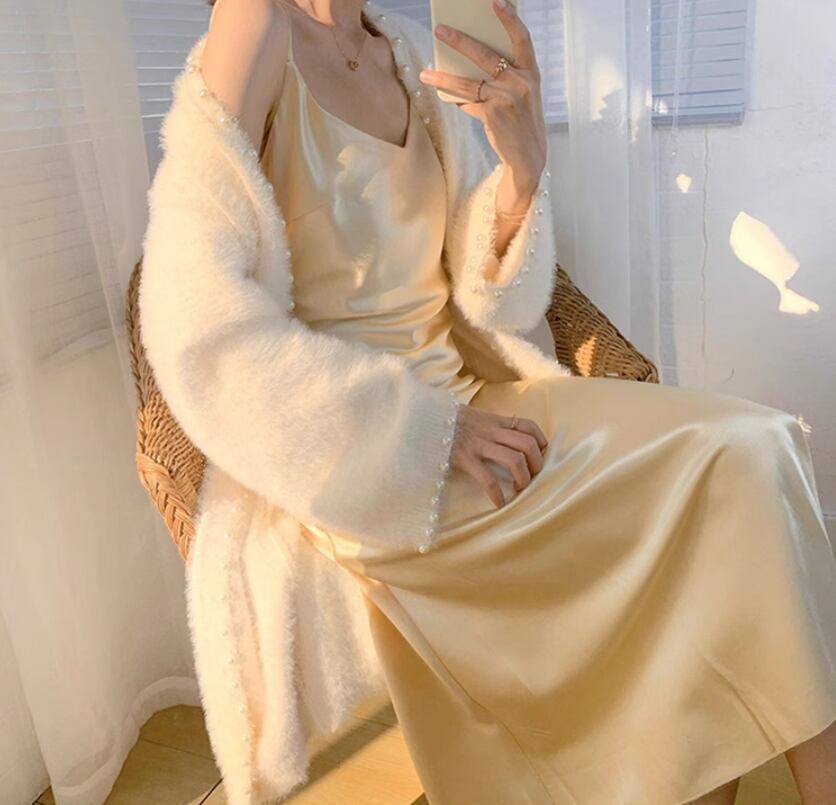 ふわふわカーデにフェイクパールがキュート、ミドル丈のロングカーディガン☆