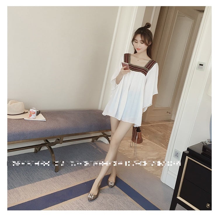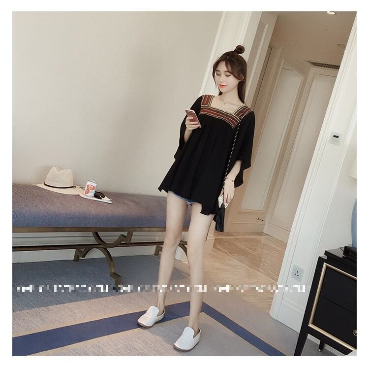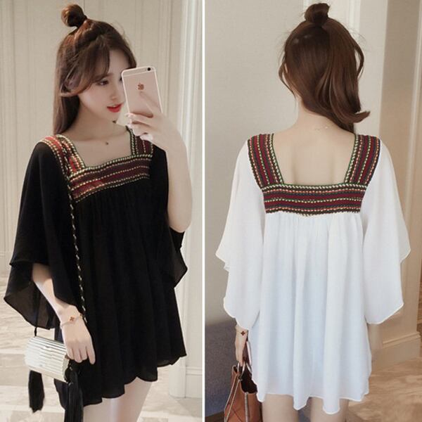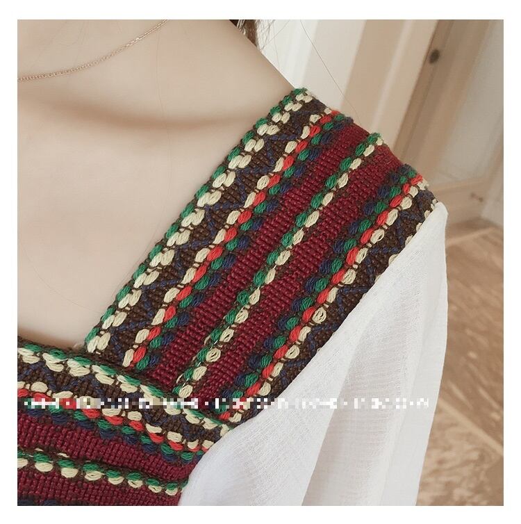 端正なスクエアネックにトレンドのボヘミアン調の刺繍風切り替えのあしらいで甘さを加えたブラウスです!