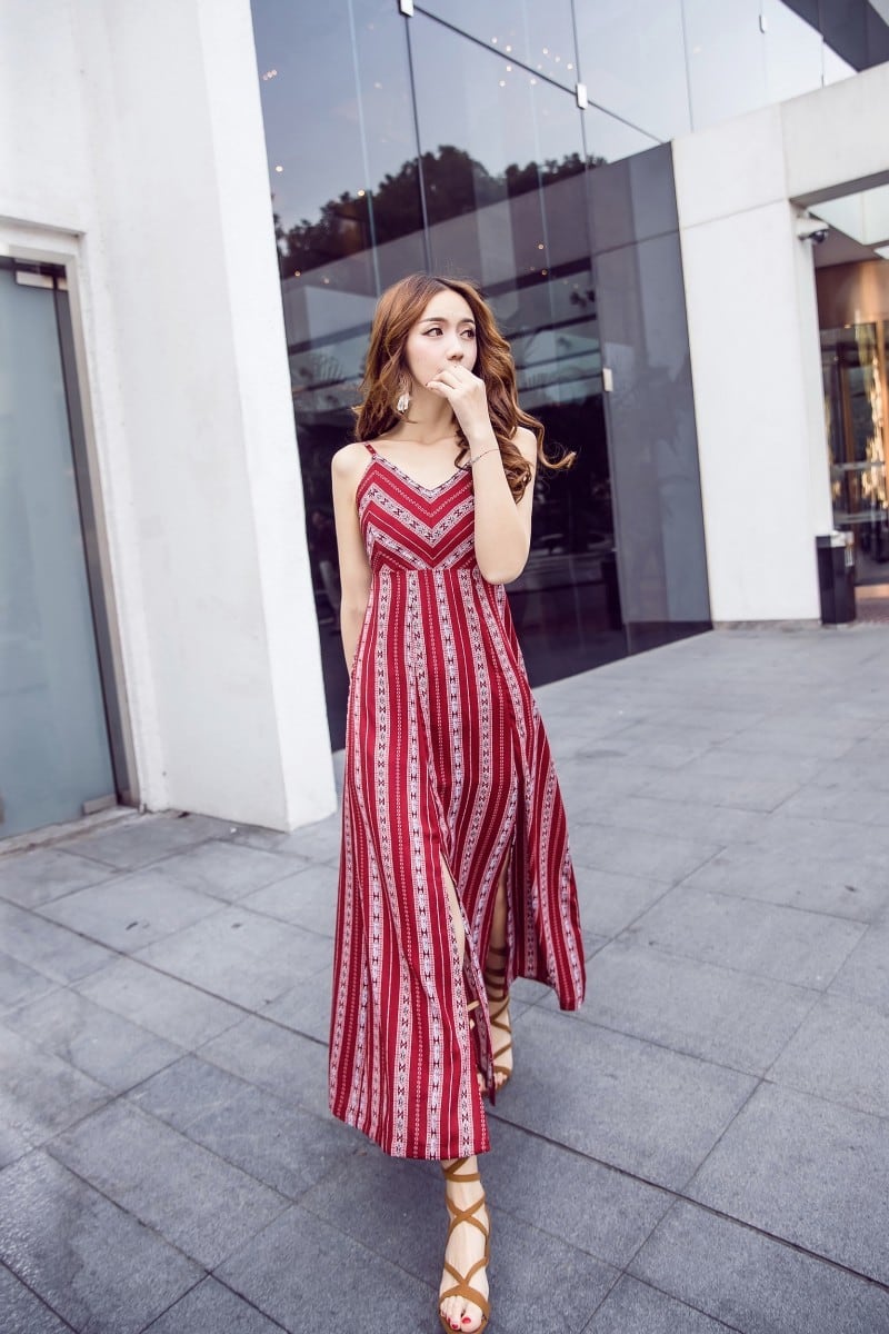 【ワンピース】ロング ノースリーブ ノーカラー キャミソールワンピース ストライプ ワンピース 春夏