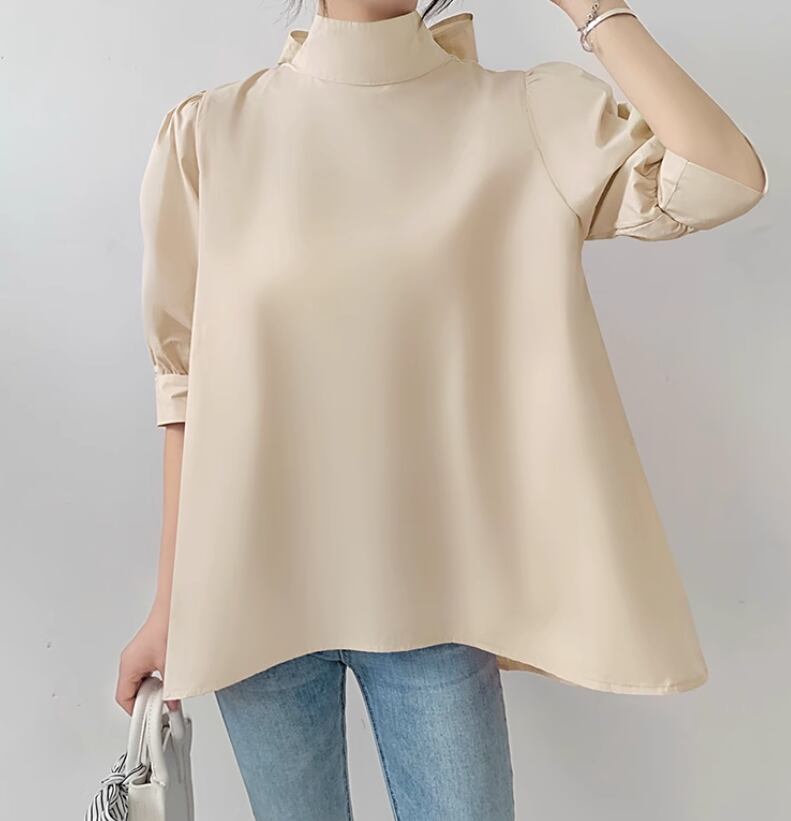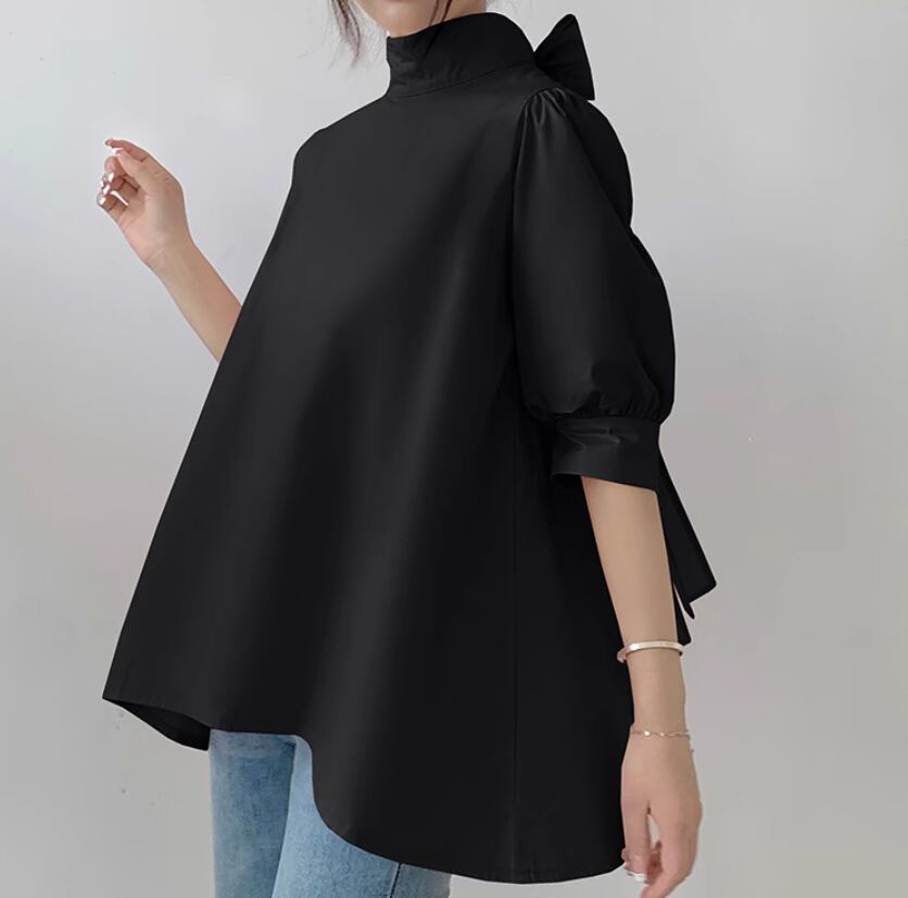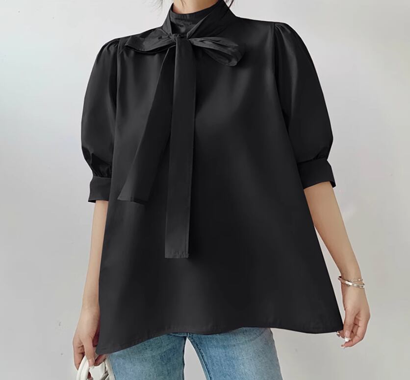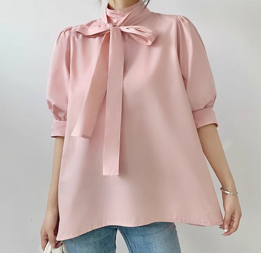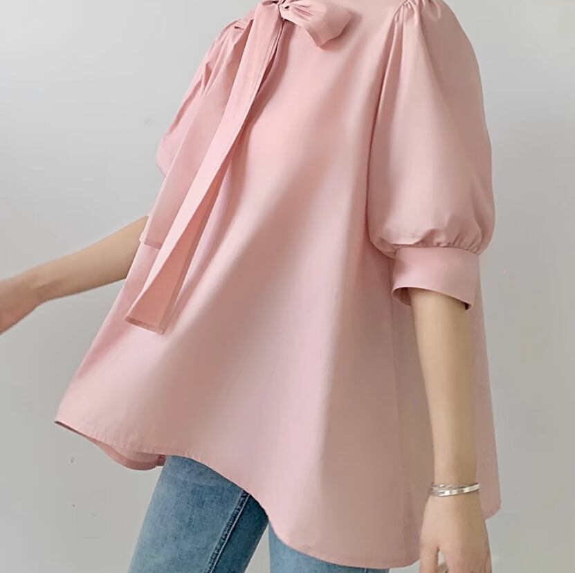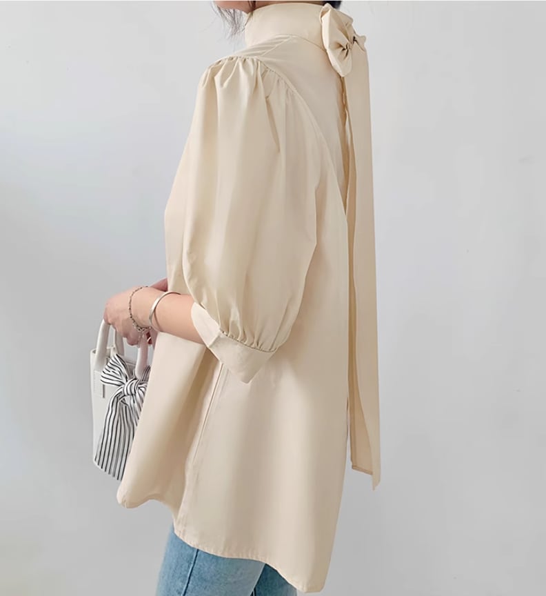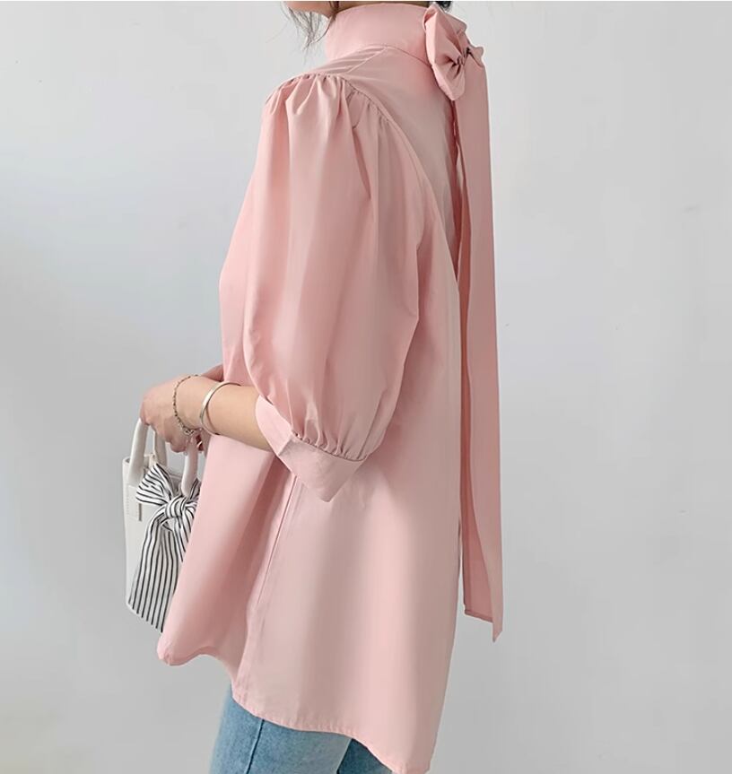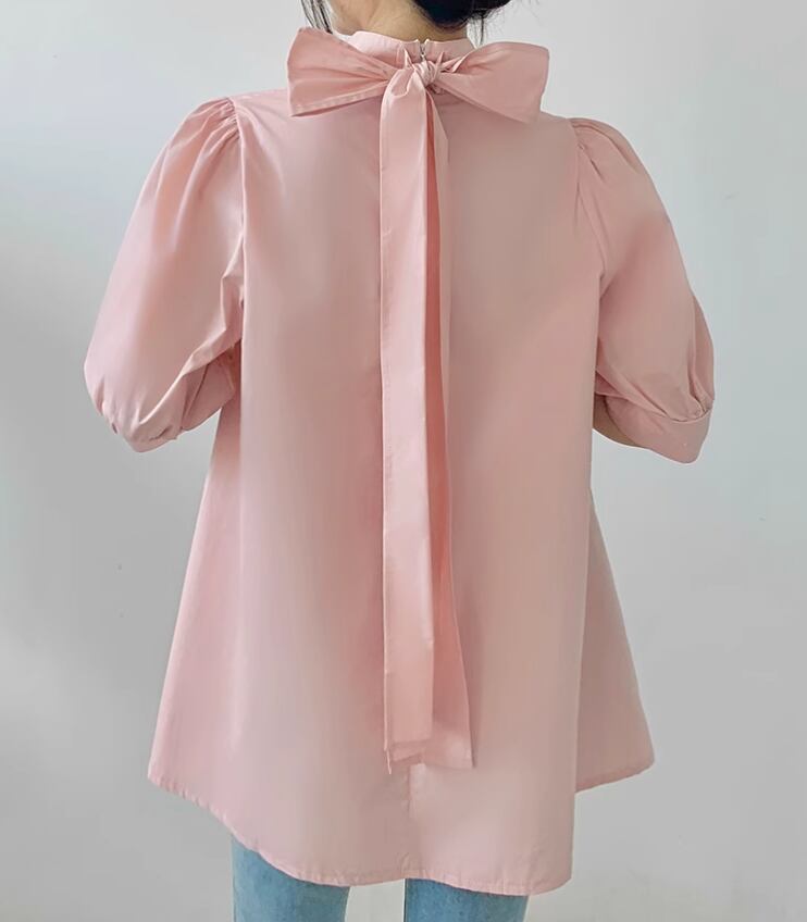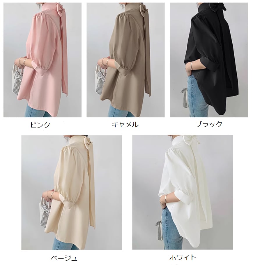 【入園入学・卒園卒業にも☆レディース ブラウス】 トップス シャツ ブラウス レディース リボン 蝶ネクタイ バックコンシャス パフスリーブ 五分袖 オフィスカジュアル シンプル 無地 母 スーツ 二次会 通勤 発表会 結婚式 普段着 入園入学 卒園卒業 送料無料のご案内です☆