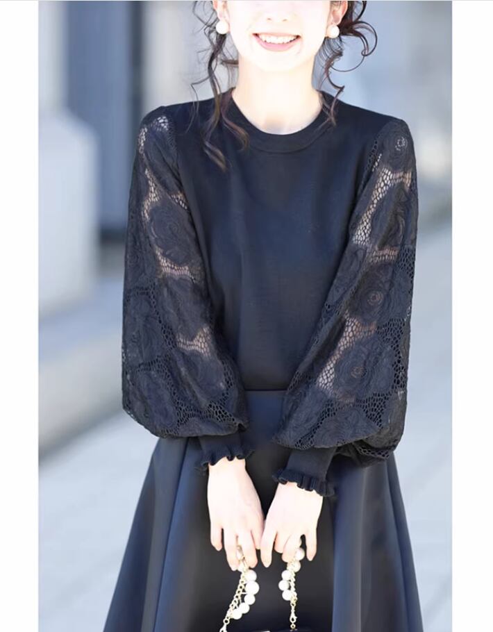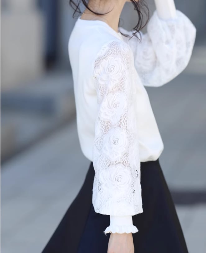 花柄のレース袖が女性らしさを引き立て、シアーな素材で華やかさもプラス。