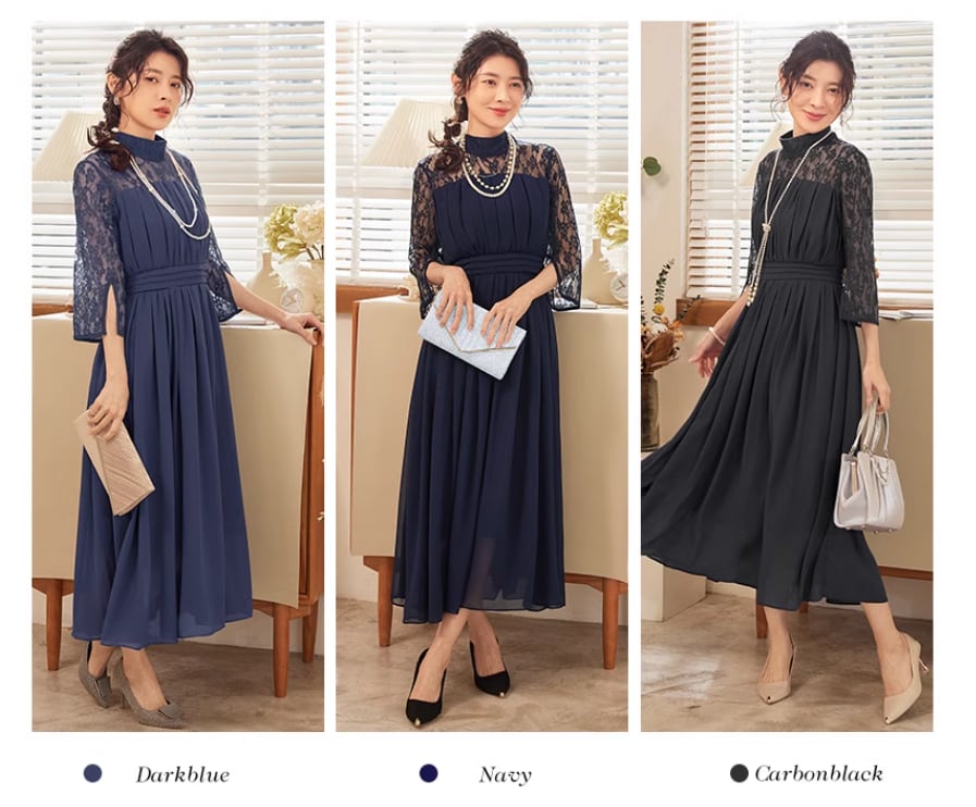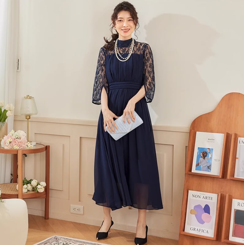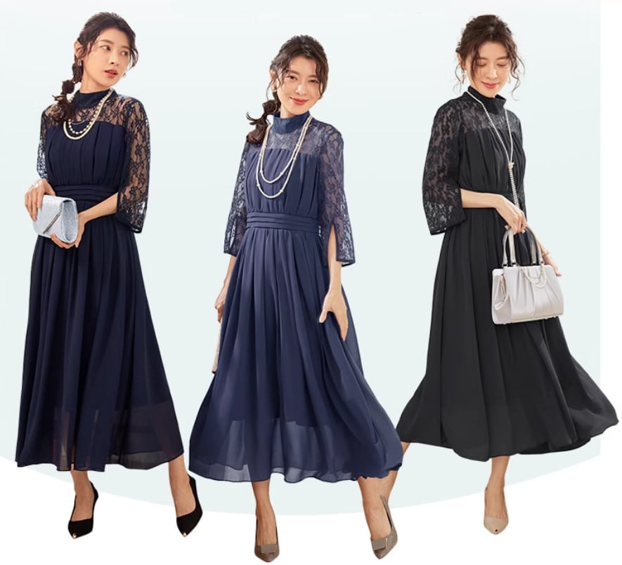 【3色展開ドレス☆レディース フォーマル ワンピ】 ワンピース フォーマル ドレス レディース ロング丈 シアー シフォン フレア 五分袖 上品 ワンピ ネイビー ブラック ブルー 20代 30代 40代 七五三 謝恩会 二次会 発表会 結婚式 入園入学 卒園卒業 送料無料