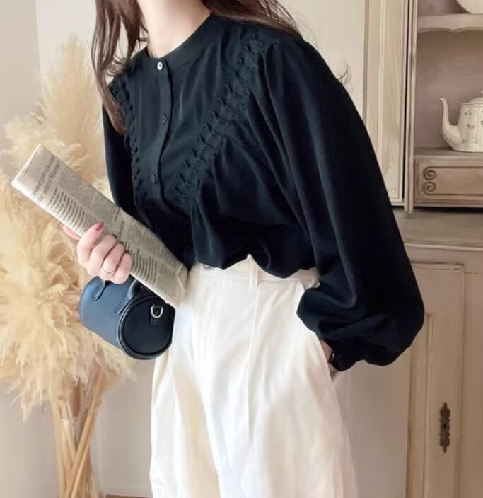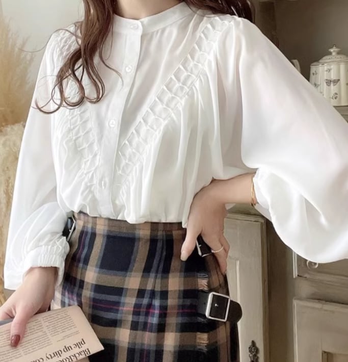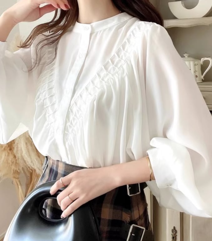 ボリュームのある可愛らしいぽわん袖と抜け感のあるデザインと素材感が甘すぎない大人の雰囲気を演出。