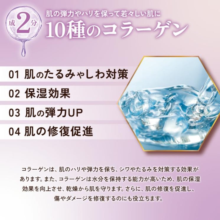 ●成分表示/水、トリ(カプリル酸/カプリン酸)グリセリル、グリセリン、BG、ペンチレングリコール、ベヘニルアルコール、ジメチコン、セテアリルアルコール、ポリソルベート60、ステアリン酸グリセリル(SE)、カルボマー、トコフェロール、グリチルリチン酸2K、キサンタンガム、水酸化K、シアノコバラミン、水溶性プロテオグリカン、アンズ核油、イソステアリン酸、ヒト脂肪細胞順化培養液エキス、ビルベリー果実エキス、加水分解コラーゲン、サトウキビエキス、レモン果実エキス、イソステアロイル加水分解コラーゲン、水添レシチン、水溶性コラーゲン、コシロノセンダングサエキス、酒粕エキス、プラセンタエキス、オレンジ果実エキス、サトウカエデエキス、加水分解ハトムギ種子、1,2-ヘキサンジオール、アルニカ花エキス、キュウリ果実エキス、セイヨウキズタ葉/茎エキス、セイヨウニワトコ花エキス、ゼニアオイ花エキス、パリエタリアエキス、ポリソルベート80、ユキノシタエキス、アシタバ葉/茎エキス、加水分解サケ卵巣膜エキス、水溶性コラーゲンクロスポリマー、サクシノイルアテロコラーゲン、ナットウガム、ボタンエキス、カプリリルグリコール、クズ根エキス、サガラメエキス、ヒアルロン酸アスコルビルプロピル、酢酸トコフェロール、カプリロイルジププチド-17、フェノキシエタノール、香料