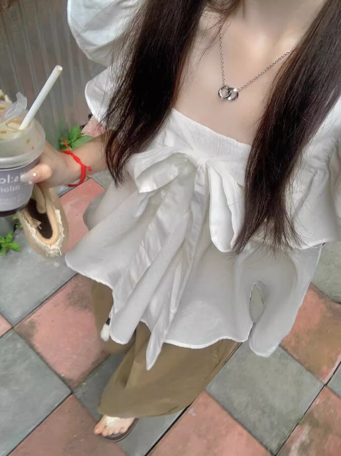 キュートな肩のフリルとリボンがポイントのトップス☆