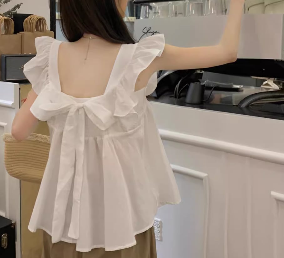 【前後2way☆レディース シンプル トップス】 トップス レディース シャツ ブラウス ノースリーブ 肩フリル リボンタイ ホワイト 春 夏 秋 チュニック 可愛い 大人可愛い きれいめ カジュアル 韓国ファッション スクエアネック 10代 20代 30代 40代 送料無料のご案内です☆