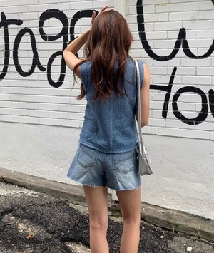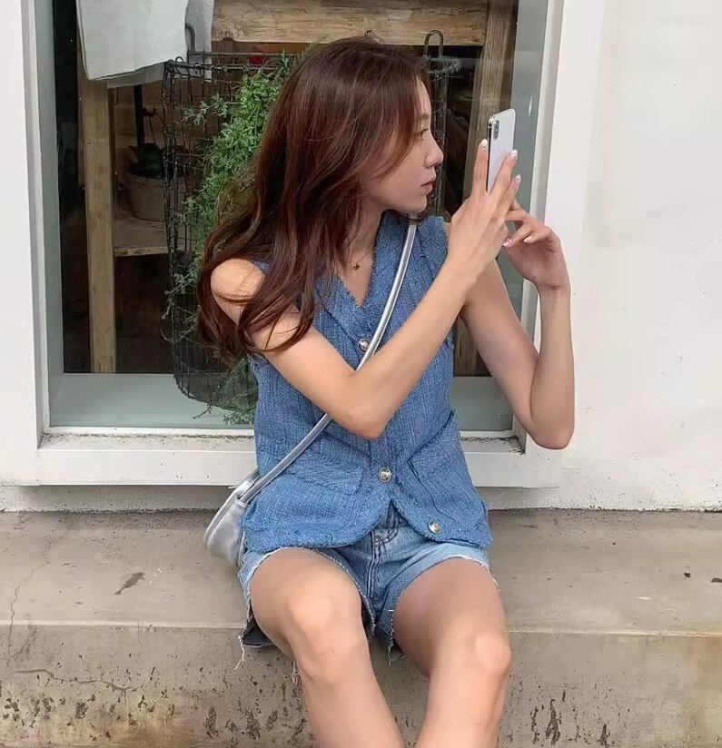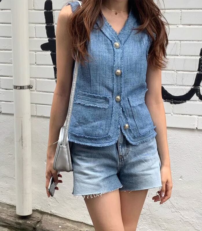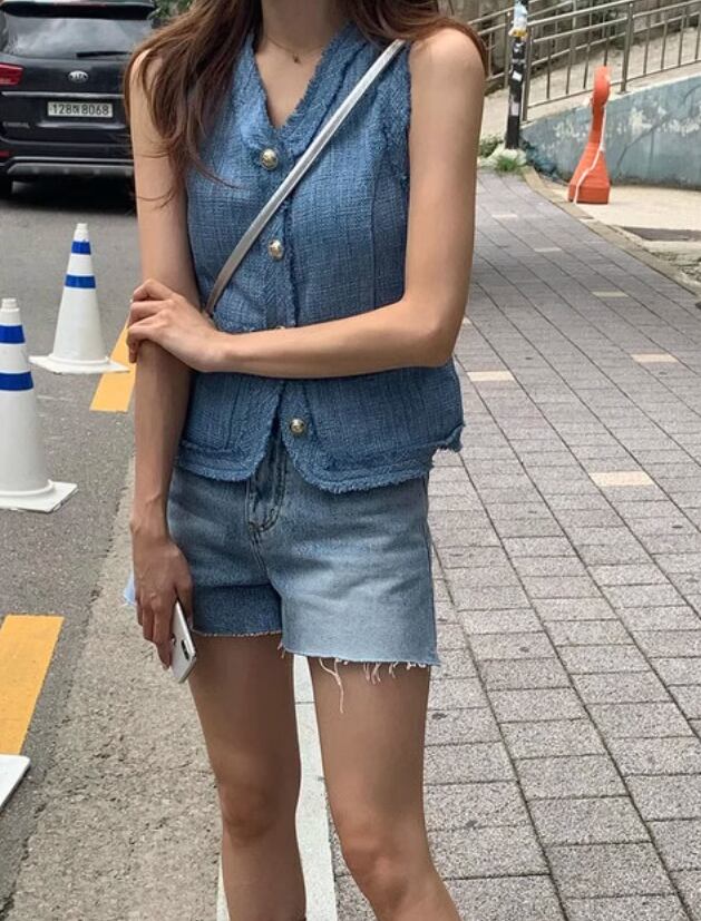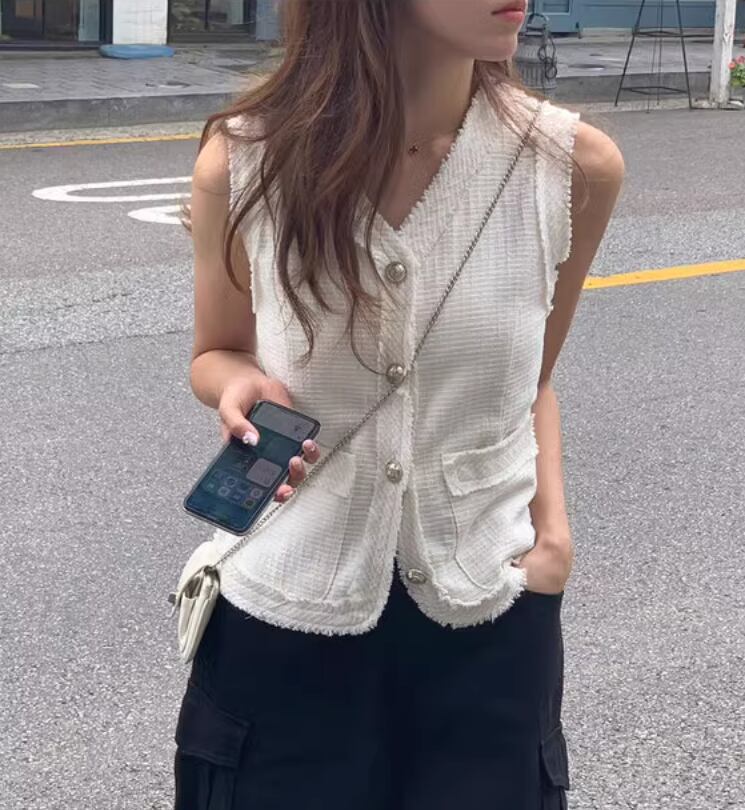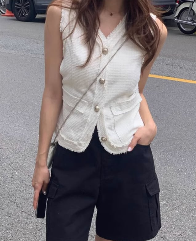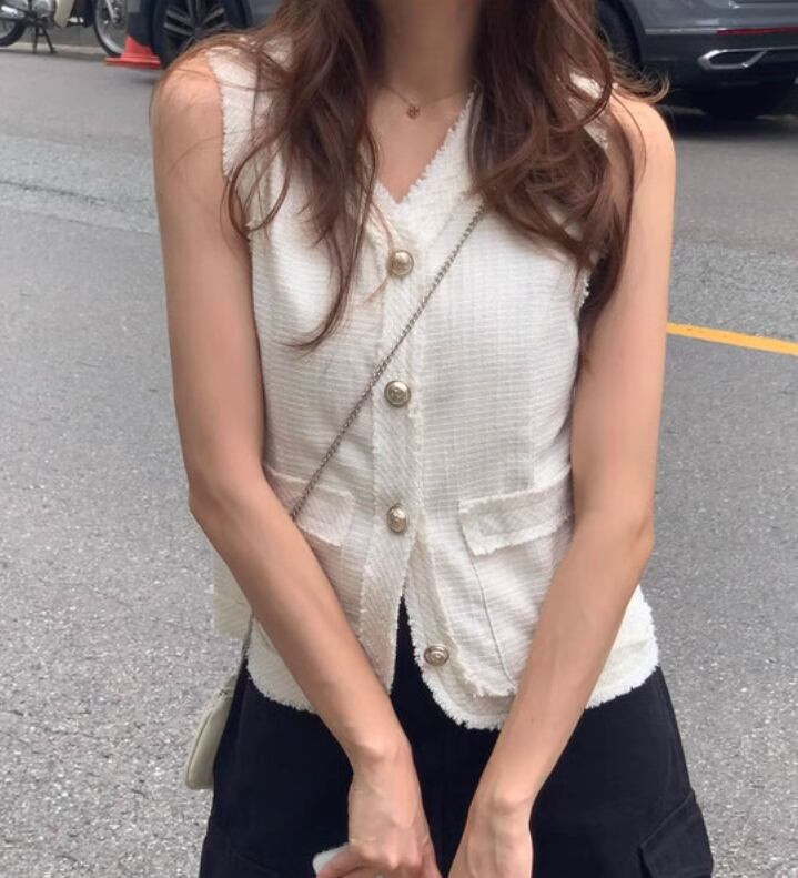 【メタルボタン☆ノースリーブ ツイード風 トップス】 トップス レディース ベスト ジレ ノースリーブ タンクトップ ツイード風 Vネック 大人カジュアル きれいめ 春 夏 秋 シンプル 韓国ファッション 20代 30代 40代 送料無料のご案内です☆