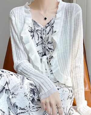 【柔らか生地☆レディース フリル カーディガン】 カーディガン レディース 長袖 カーデ フリル リボン 柔らか生地 春 夏 秋 シアー シアー 韓国ファッション フェミニン Vネック 20代 30代 40代 送料無料