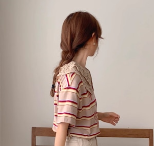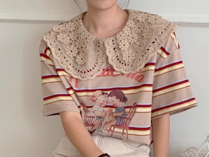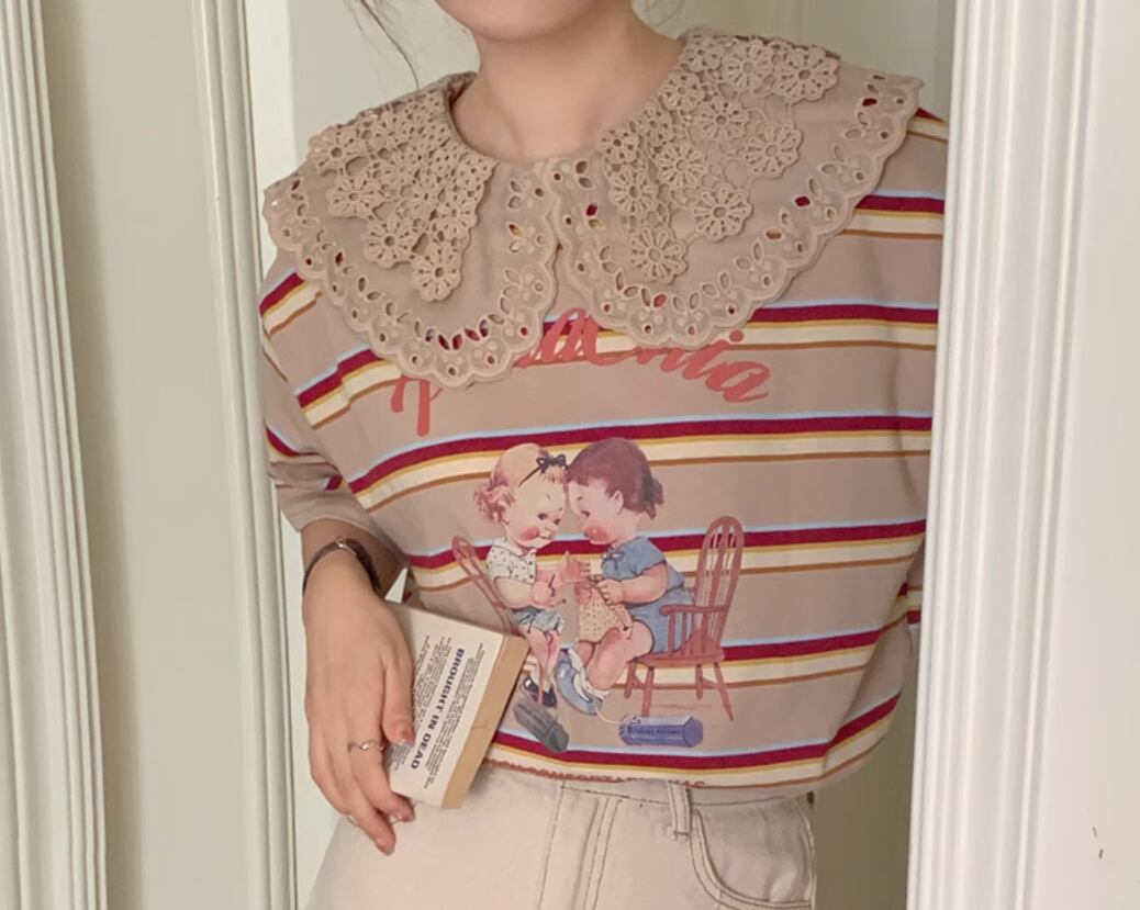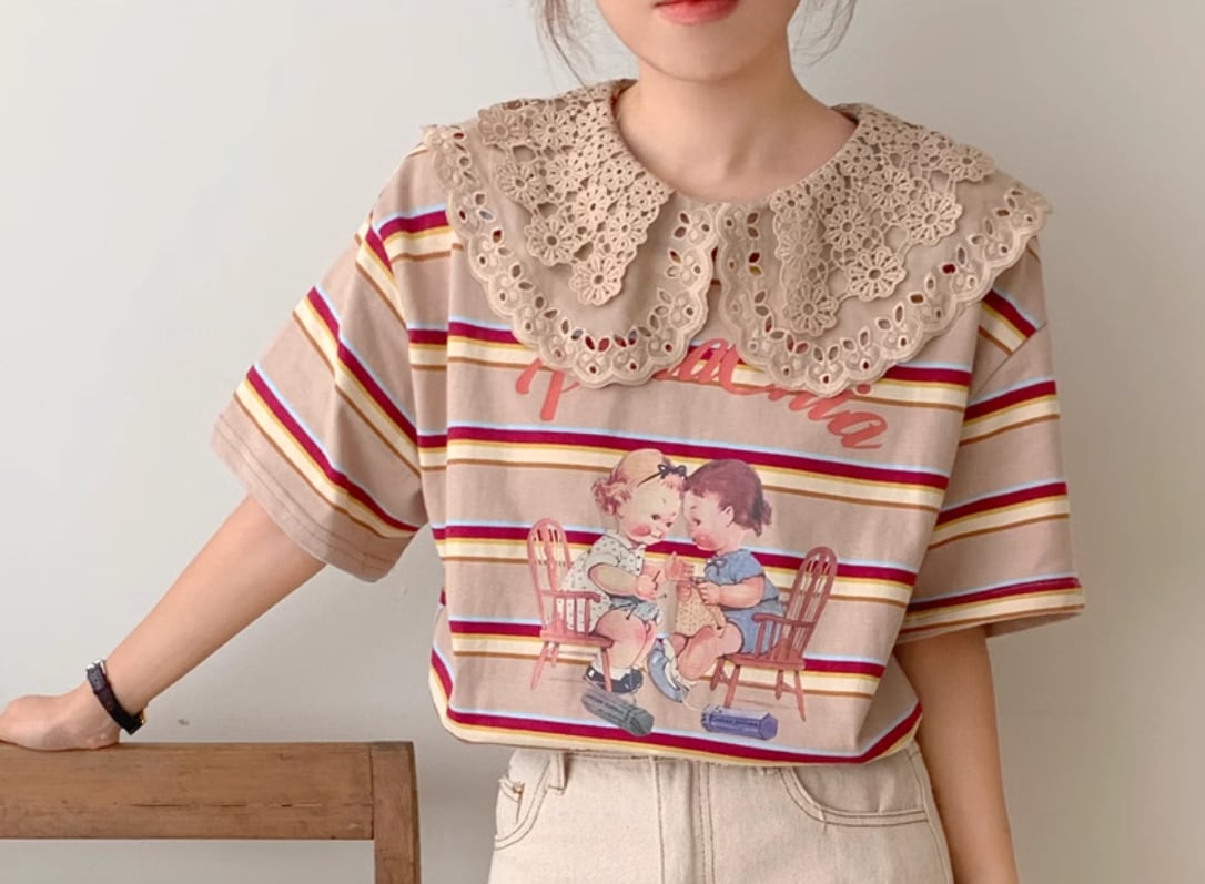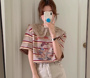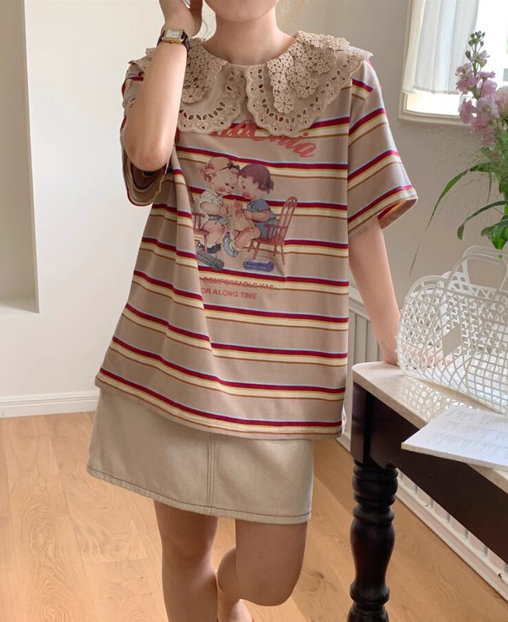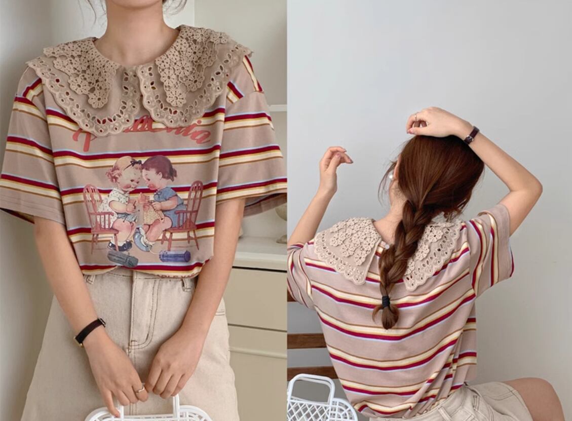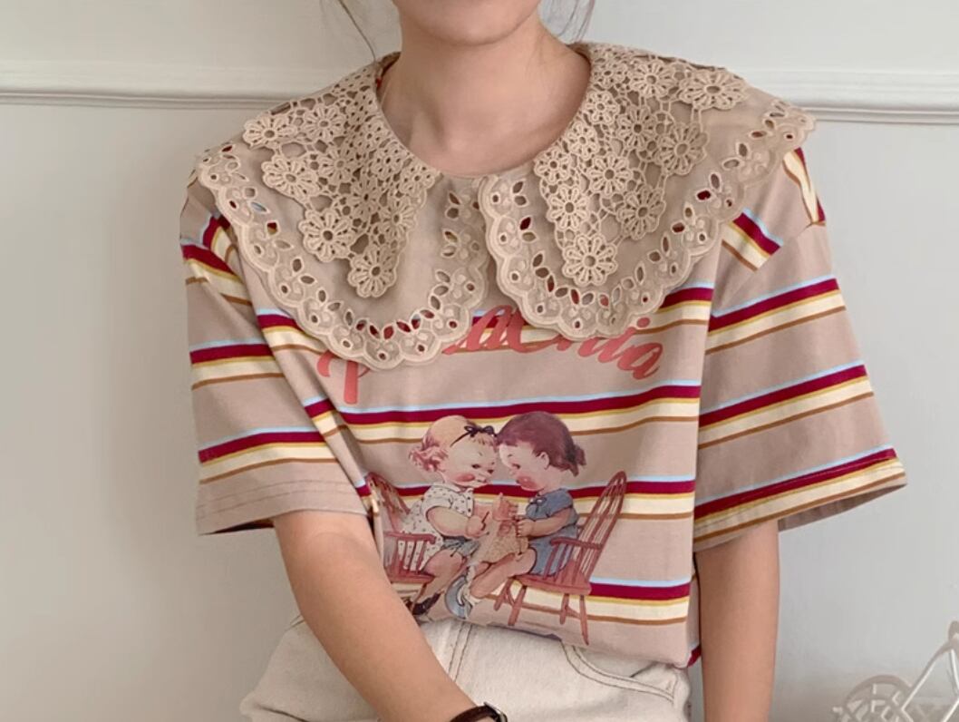【レトロ柄☆レース ビックカラー レトロTシャツ】トップス レディース カットソー レトロ柄 ビックカラー ボーダー 半袖 Tシャツ 韓国ファッション 春 夏 秋 10代 20代 かわいい カジュアル レース襟 送料無料