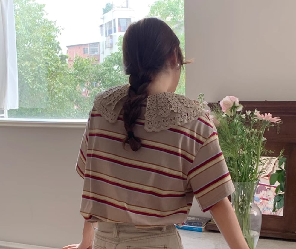 【レトロ柄☆レース ビックカラー レトロTシャツ】トップス レディース カットソー レトロ柄 ビックカラー ボーダー 半袖 Tシャツ 韓国ファッション 春 夏 秋 10代 20代 かわいい カジュアル レース襟 送料無料のご案内です☆