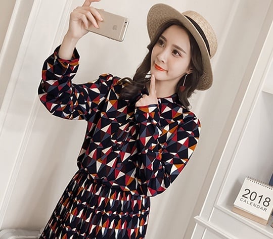 【春レトロ☆彡 幾何学柄ロングワンピース】通勤 デート 学生韓国スタイル トレンド ワンピース ワンピ 幾何学柄 フリル プリーツワンピ オシャレ 楽ちん 上品 デイリー 可愛い きれいめ お出かけ デート