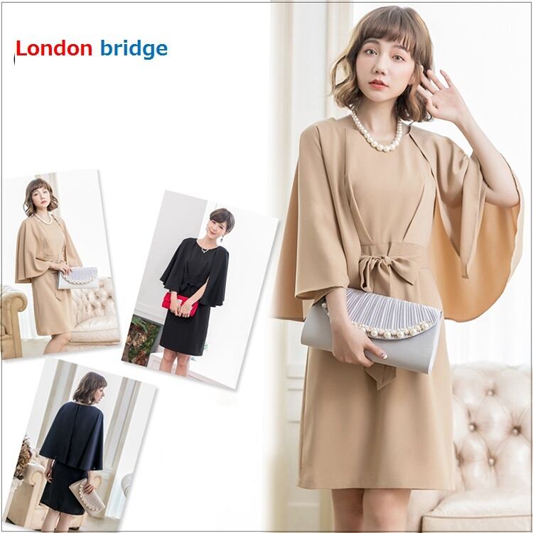 【体型カバーも出来る!パーティードレス ケープ風ワンピース】 入園入学 卒園卒業 5分袖 膝丈 タイト ウエストリボン ラウンドネック 体型カバー 大きいサイズ 結婚式 披露宴 二次会 お呼ばれ 20代 30代 黒色 紺 ネイビー ブラック ベージュ フォーマルドレスレディース フォーマル 春 夏 秋 冬 送料無料